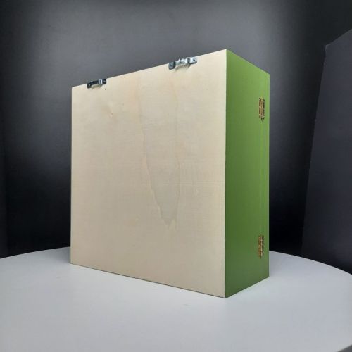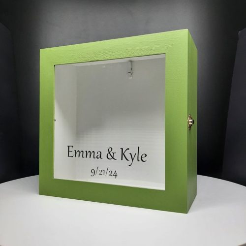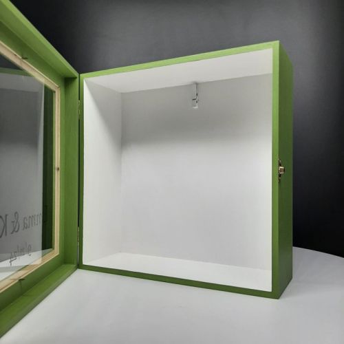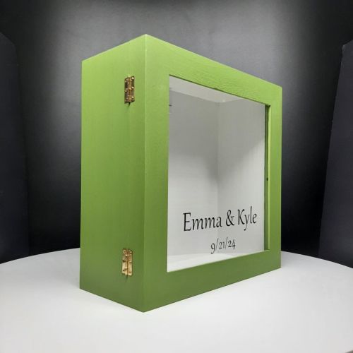 Shadow box with glass door; THIS IS A TWO COLOR OPTION - ONE COLOR OUTSIDE AND OTHER INSIDE; Inside dimensions:   11 3/8" x 11 3/8" x 4 6/8" ; For detailed description, please see DESCRIPTION below.