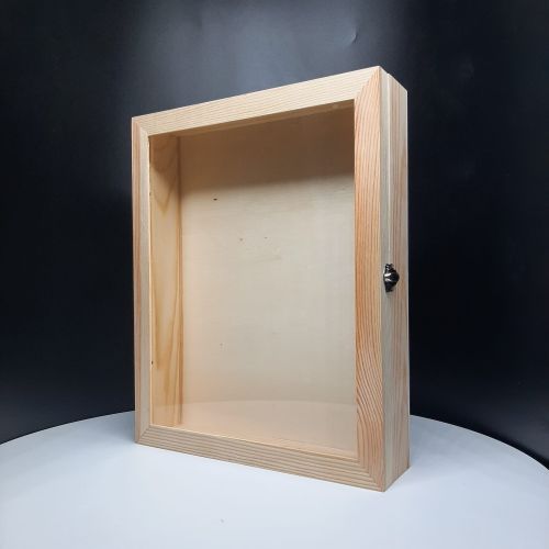 Shadow box with glass door; Inside dimensions: 11 3/8" x 14 5/16" x 2 6/8" ; For detailed description, please see DESCRIPTION below.