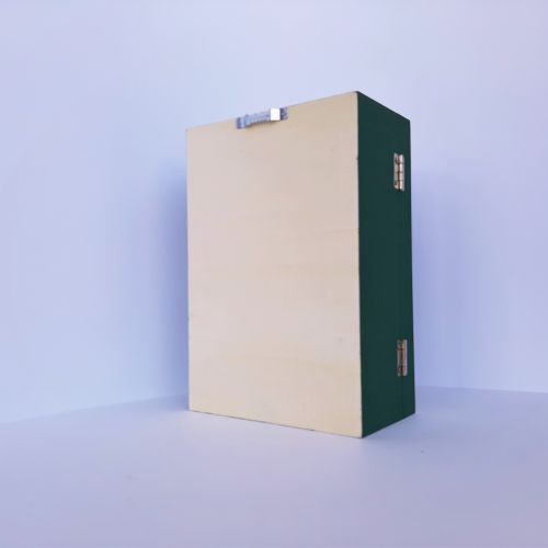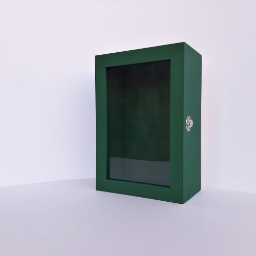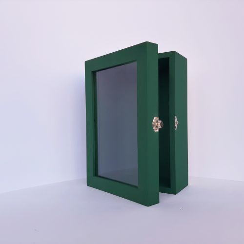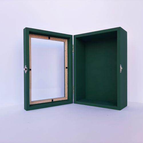 Shadow box in Hunter Green color with glass door; Inside dimensions:   5 1/8" x 7 7/8" x 2 7/8" ;