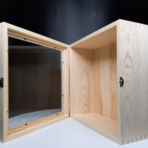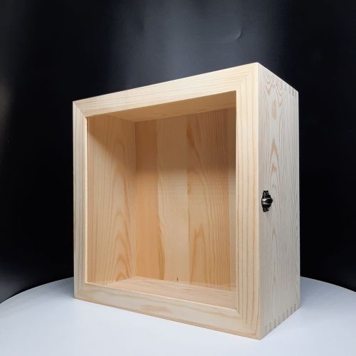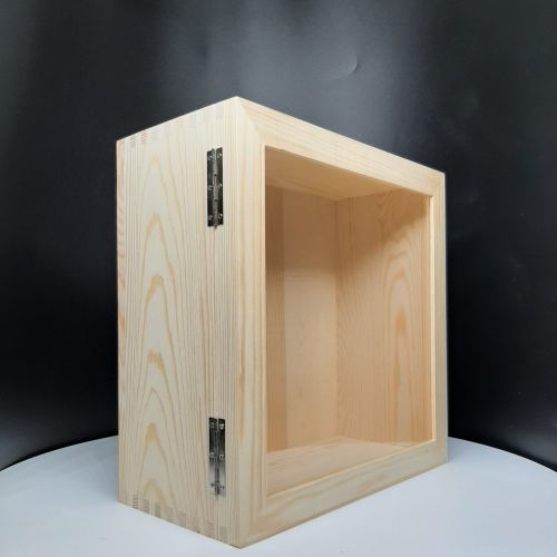 Large extra deep shadow box with glass door, made of pine wood, back panel made of plywood.