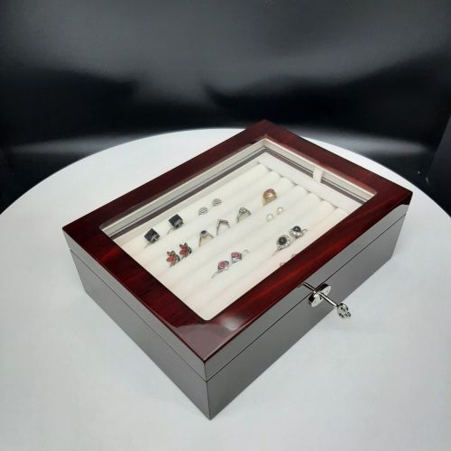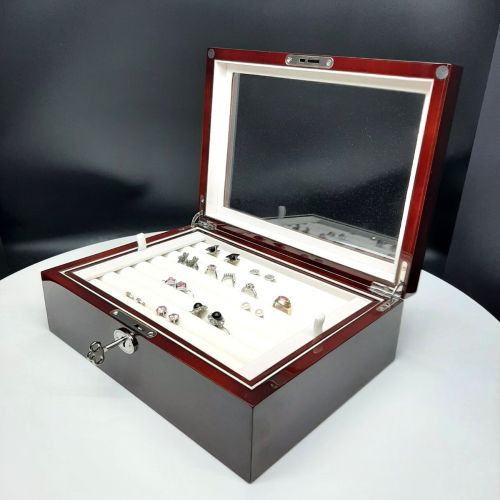 Jewelry box with glass door and lock;   For detailed description, please see DESCRIPTION below.