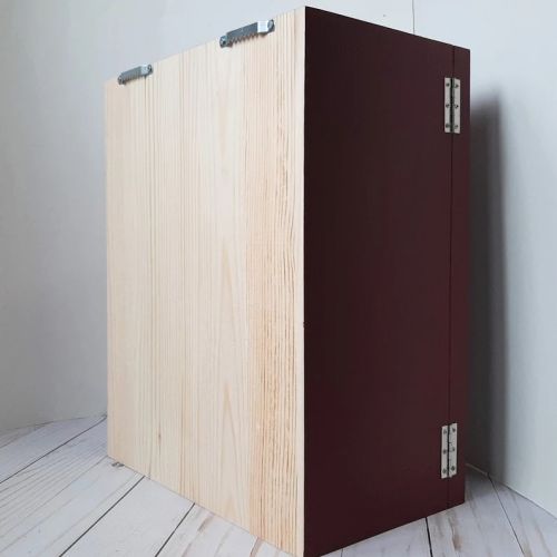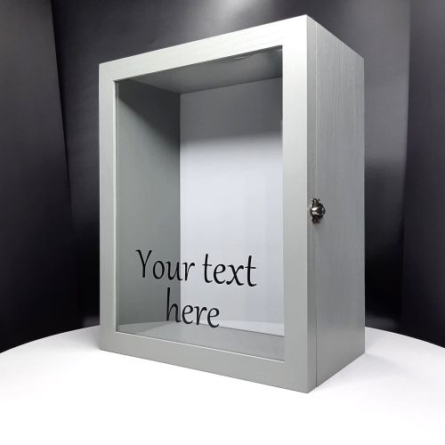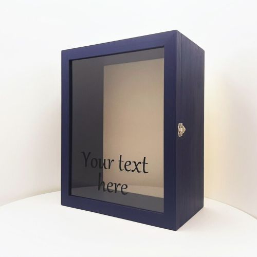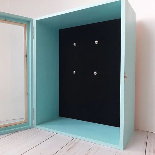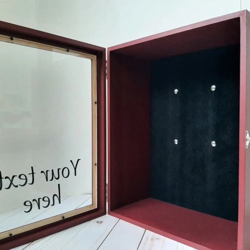 Extra deep wooden shadow box with glass door and soft velvet backing.